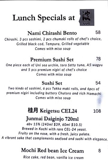 One piece each of Maguro blue fin tuna, Suzuki seabass, Atlantic Salmon and 5 more chef's choice. Comes with a miso soup.